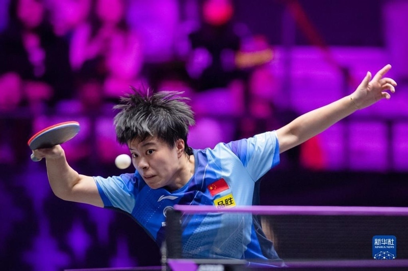 2023年4月20日,中國選手王藝迪在比賽中回球。當(dāng)日,在澳門塔石體育館舉行的2023世界乒乓球職業(yè)大聯(lián)盟(WTT)澳門冠軍賽女子單打比賽中,中國選手王藝迪以3比2戰(zhàn)勝波多黎各選手阿德里安娜·迪亞茲,晉級八強。