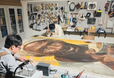 二〇二二年底,工作人員正在觀察油畫《父親》并準(zhǔn)備進(jìn)行修復(fù)。 寇旭乾攝