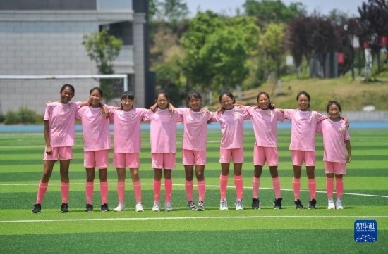 來自涼山彝族自治州的9名小球員俄地么你作、舍布么扯鳩莫、候杰欣、吉聯(lián)么李雪、呂小英、趙明練、楊貴洋、拉普么拉扎、楊建鑫(從右至左)在瀘州天立春雨學(xué)校足球場留影(5月12日攝)。