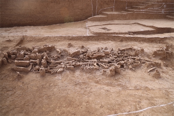 在“郭城”東南拐角處,發(fā)現(xiàn)一條殷墟時(shí)期的大型祭祀溝,長(zhǎng)達(dá)19.36米,溝內(nèi)堆疊了3層人骨及動(dòng)物骨骼,初步清理出完整的人骨3具,以及肢解的牛骨、豬骨、馬骨、鳥(niǎo)骨等,經(jīng)動(dòng)物考古學(xué)家辨認(rèn)至少分屬17個(gè)動(dòng)物個(gè)體??脊趴碧竭€發(fā)現(xiàn)不同時(shí)期的道路遺跡穿過(guò)城壕,為探討洹北商城內(nèi)外部交通路網(wǎng)提供了重要線(xiàn)索。