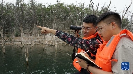 北京市水務(wù)局密云水庫(kù)管理處水生態(tài)管護(hù)員在觀察和記錄候鳥(niǎo)育雛情況(5月31日攝)。