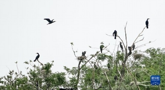 準(zhǔn)備學(xué)習(xí)飛翔的幾只鸕鶿幼鳥(niǎo)棲息在密云水庫(kù)“鳥(niǎo)島”的樹(shù)上(5月31日攝)。