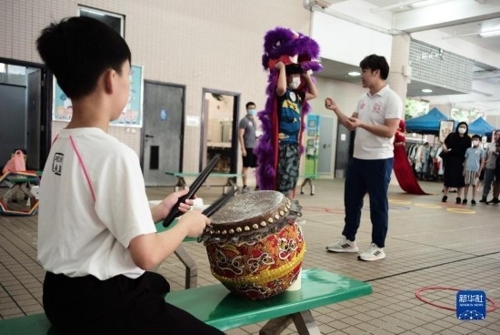 在香港漢華中學(xué),小朋友體驗舞獅表演(6月18日攝)。