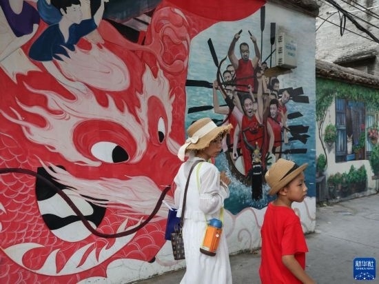 6月22日,游人經過佛山疊滘東勝村一面龍船彩繪墻壁。
