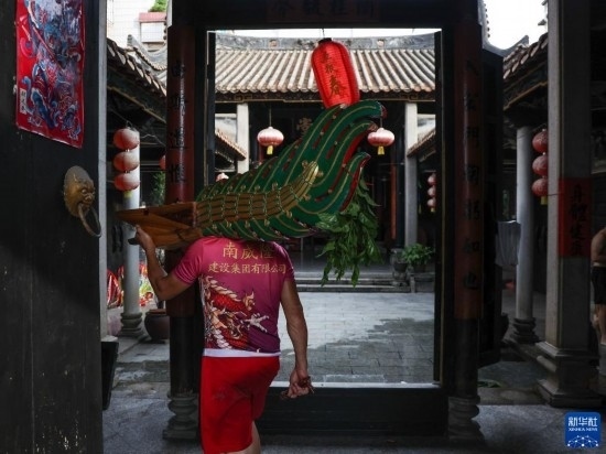6月22日,佛山疊滘端午龍船漂移賽結束后,“扒仔”(槳手)將龍船的龍頭龍尾請回家族祠堂保管。