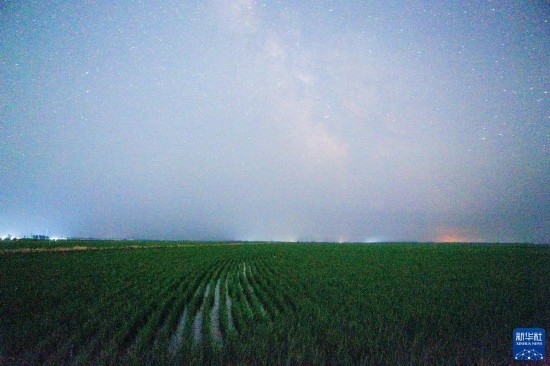 這是6月25日夜晚在黑龍江省富錦市萬畝水稻公園內(nèi)拍攝的稻田和星空(長(zhǎng)時(shí)間曝光)。