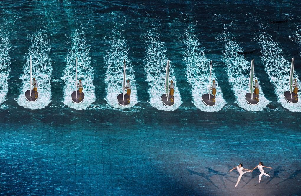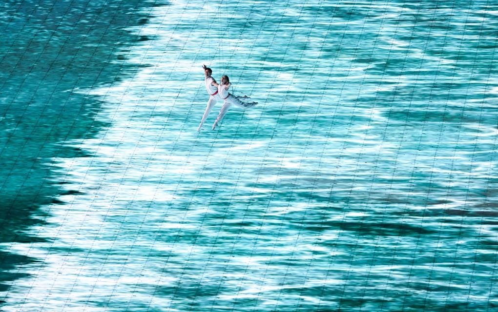 本屆亞運(yùn)會(huì)首次將3D雙威亞技術(shù)應(yīng)用于大型運(yùn)動(dòng)場中。立體飛旋于空中的男女演員與潮共舞,吊著威亞的他們?cè)诳罩型瓿闪烁鞣N高難度動(dòng)作,并與地屏中的浪潮實(shí)時(shí)互動(dòng),踏浪而行,成就了科技與藝術(shù)完美融合。