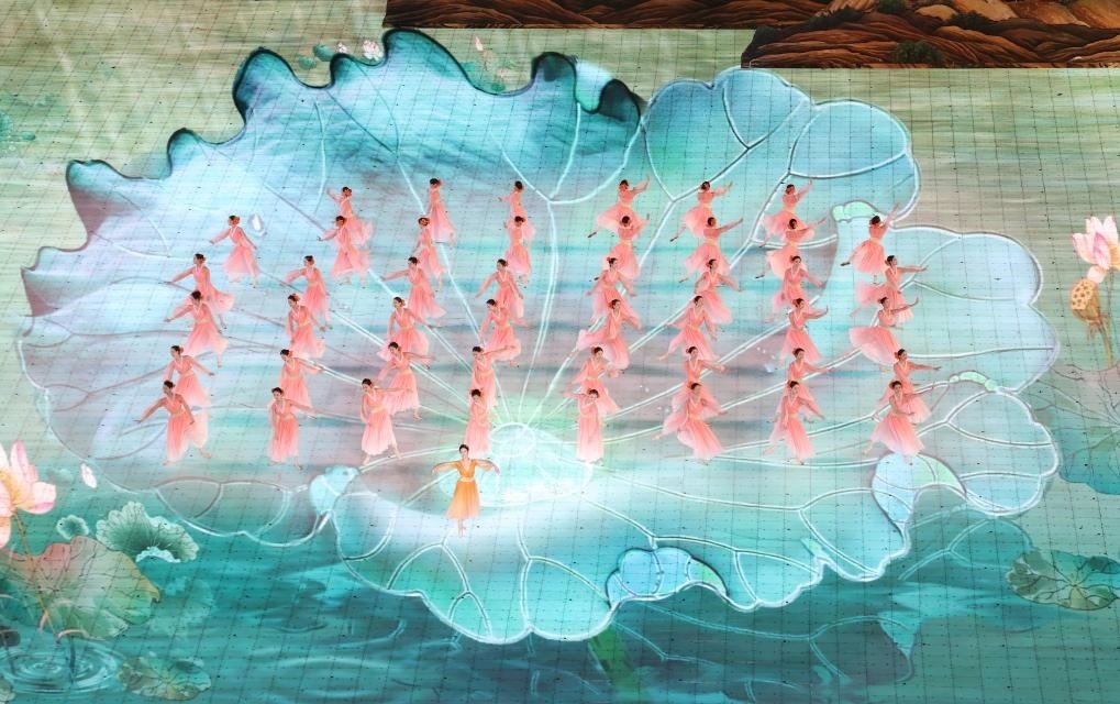 地屏上,錯(cuò)落有致的立體山水映襯著江南朦朧的裸眼3D視效,營造出輕煙繚繞、水光瀲滟的江南畫境。國風(fēng)男子揮毫作畫,風(fēng)雅錢塘展現(xiàn)在觀眾眼前。煙雨西湖上,碩大的蓮葉舒展,清雅雋秀的女子翩然起舞,仿若盛開的蓮花。