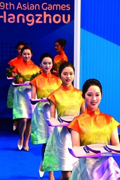 9月30日,亞運(yùn)會(huì)跳水項(xiàng)目頒獎(jiǎng)儀式上,禮儀人員手托裝有獎(jiǎng)牌的托盤(pán),面帶笑容走向頒獎(jiǎng)臺(tái)。本報(bào)記者 楊震攝/光明圖片