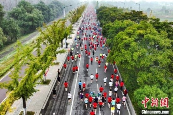 馬鞍山半程馬拉松比賽鳴槍開跑。(無人機照片)張強 攝