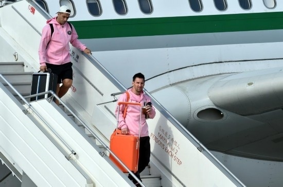 2月2日,梅西與其效力的邁阿密國際隊抵達(dá)香港國際機場,圖為梅西(右)與蘇亞雷斯走下舷梯。新華社記者 盧炳輝 攝