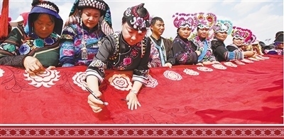 在直苴村“賽裝節(jié)”上,繡娘們正在布匹上勾畫(huà)喜慶圖案。何新文攝(影像中國(guó))