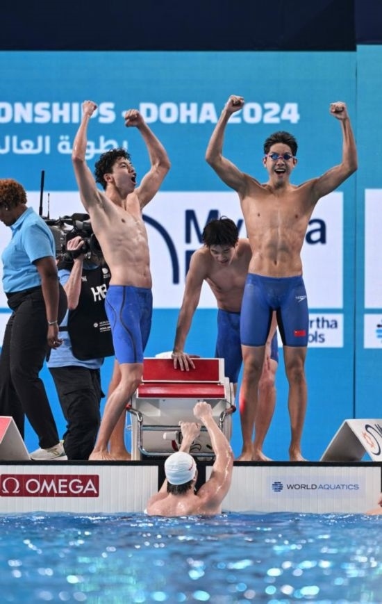 11日,中國農歷甲辰龍年大年初二,多哈世界游泳錦標賽游泳項目第一個比賽日,潘展樂和隊友季新杰、張展碩、王浩宇在男子4×100米自由泳接力決賽中以3分11秒08贏得金牌,為中國男子游泳創(chuàng)造歷史!中國游泳此前還從未獲得過世錦賽或者奧運會的男子接力冠軍。