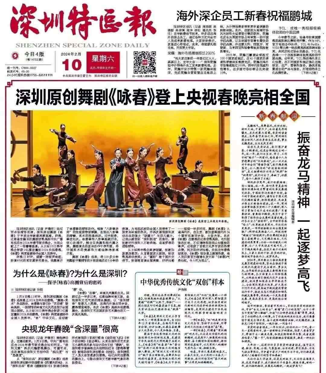 《深圳特區(qū)報》在大年初一頭版頭條對《詠春》做了報道。光明日報原總編輯何東平等首都文化界專家學者在采訪中紛紛為《詠春》成功登陸春晚大舞臺而點贊。
