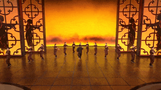 《詠春》來自舞劇《詠春》選段,已經上演了百場,但在春晚是個特別的版本。為了創(chuàng)造出更加意蘊豐富的想象空間,總臺臺長慎海雄在推薦這個舞劇片段時,提出了幾個建議,包括演員服裝從黑色的香云紗改為絳紅色,男女主角之間的關系要從男主角一一過招“大敗”女主角改為相互切磋武藝,開場以男主角的武術剪影來增強吸引力,通過使用剪影效果來展現“葉問”的出場。當燈光亮起,窗欞上“詠春拳”三個書法大字淡去,“葉問”的剪影如同舞動的水墨畫一般,隨即演員閃身舞出屏風,影子與真身共舞。由虛入實,由平面到立體,“剪影”的設計讓短短半分鐘的獨舞大大增加了層次感和觀賞性,為空曠的舞臺創(chuàng)造出一個“頂天立地”的葉問之影,視覺震撼瞬間放大,堪稱畫龍點睛之筆。