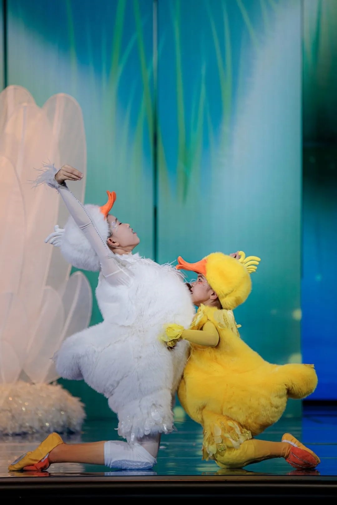在初始版本中只有“小白鵝”,總臺臺長提出要把孩子們的憨態(tài)可掬呈現得更極致一些,要有幽默感、有劇情感,并建議增加一只“搗亂”的“小黃鴨”。經過重新編排,舞蹈一下子有了更多靈氣,“小黃鴨”穿梭在大小白鵝之中,不僅讓整體清冷的色調增加了一抹暖色,還讓舞蹈內容更加豐富,童趣更加飽滿。