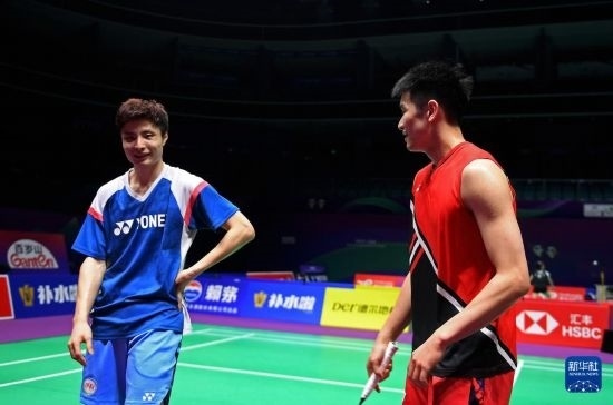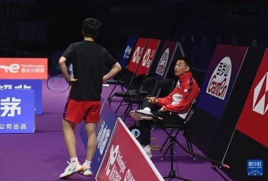 4月26日,中國(guó)羽毛球協(xié)會(huì)副主席夏煊澤(右)在訓(xùn)練中指導(dǎo)王祉怡。新華社記者 侯昭康 攝