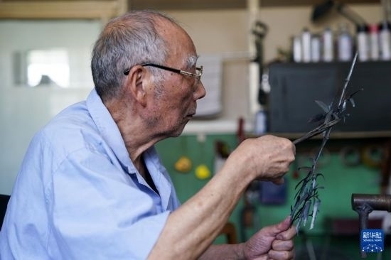 今年80歲的湯傳松,是蕪湖工藝美術(shù)廠的技術(shù)總監(jiān),也是蕪湖鐵畫鍛制技藝省級(jí)非物質(zhì)文化遺產(chǎn)傳承人。據(jù)湯傳松介紹,鐵畫鍛制工藝起源于鐵匠,需將鐵燒紅,而后使用錘頭趁熱打鐵,將鐵塑造成畫稿中的基本形狀,而后使用銼、鉆等工具進(jìn)一步塑造,乃至用剪刀、鑷子進(jìn)行修形,再將各個(gè)部位焊接組合,最后裝裱成畫,流程繁多,制作周期較長(zhǎng)。