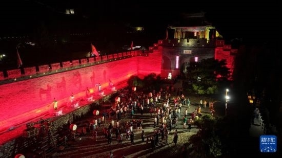 8月21日,游客在觀看“大明邊塞”之夜游黃崖關(guān)系列演出(無人機(jī)照片)。