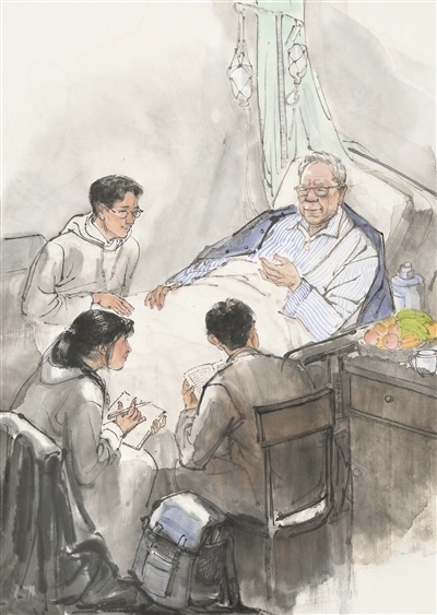 人民教師勤學篤行、求是創(chuàng)新的躬耕態(tài)度,給無數(shù)人以榜樣的力量,也給美術創(chuàng)作以靈感。“人民教育家”國家榮譽稱號獲得者衛(wèi)興華,終其一生都奮斗在勤學求真的道路上。90余歲時,即使病痛纏身,他仍堅持每天學習、工作。有感于衛(wèi)興華教授的敬業(yè)精神,高毅特意描繪了臥病在床的衛(wèi)興華堅持與學生探討學術課題的場景,主人公那專注的神情令人動容。像衛(wèi)興華這樣堅守耕耘的教師還有許多。劉昌明水彩畫《一個教師的工作臺》便以細致的場景描繪表達出對教師群體的敬意。貼著泛黃舊紙的墻面、藥瓶和墨水瓶之間的教案、脫漆的木桌、一副老花眼鏡……畫家在此調動了一切能夠反映老一輩教育者辛勤伏案的元素,象征著沒有直接出場的教師形象?!按颂師o聲勝有聲”的表達效果,令人回味無窮。