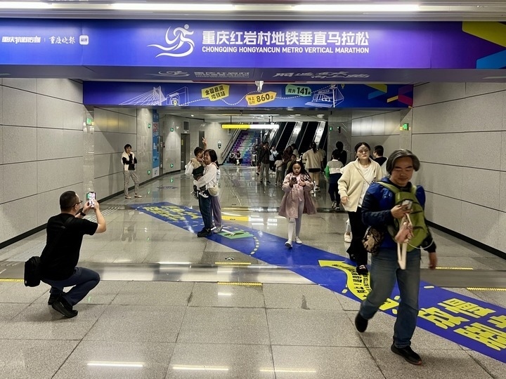 國慶前夕,這里剛舉辦了一場垂直馬拉松。賽事帶來品牌效應(yīng),前來打卡的人群絡(luò)繹不絕?!按怪瘪R拉松一般在摩天大樓里舉辦,如今地鐵站里居然能跑馬拉松,重慶總是能給游客帶來驚喜?!眮碜院颖钡挠慰蛷堥f。