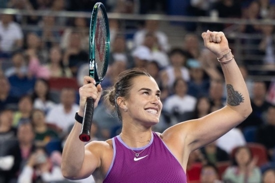 10月13日,薩巴倫卡在獲勝后慶祝。當日,在武漢網(wǎng)球公開賽女單決賽中,薩巴倫卡戰(zhàn)勝鄭欽文,奪得冠軍。新華社記者 肖藝九 攝