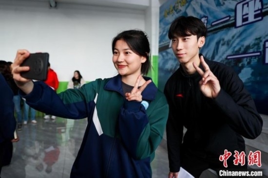 圖為浩門鎮(zhèn)(魯青)高級中學學生與梁育帥(右)尋求合照。薛蒂 攝
