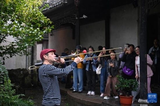 10月27日,來自瑞典的藝術(shù)表演者在南潯古鎮(zhèn)小蓮莊為游客演繹互動音樂會。