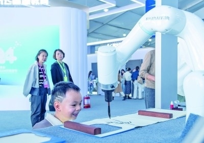 觀眾在參觀第七屆世界聲博會上的一款文藝創(chuàng)作機器人。新華社記者 傅天攝