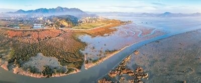 圖為閩江入??趶V闊的灘涂、被稱為“閩江口明珠”的瑯岐島以及日益繁榮的城鎮(zhèn)。