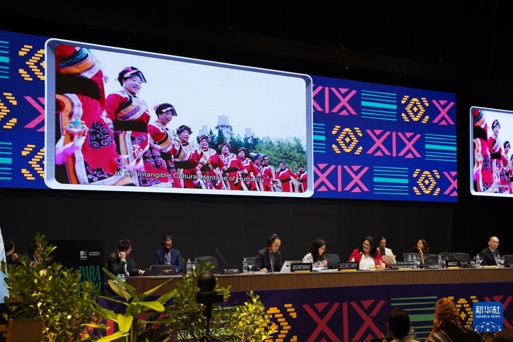 12月5日,在巴拉圭亞松森聯(lián)合國教科文組織保護(hù)非物質(zhì)文化遺產(chǎn)政府間委員會(huì)第19屆常會(huì)評審現(xiàn)場,大屏幕播放“黎族傳統(tǒng)紡染織繡技藝”宣傳視頻。新華社記者 朱雨博 攝