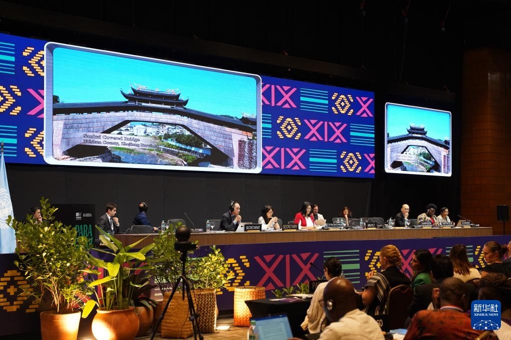 12月5日,在巴拉圭亞松森聯(lián)合國教科文組織保護(hù)非物質(zhì)文化遺產(chǎn)政府間委員會(huì)第19屆常會(huì)評審現(xiàn)場,大屏幕播放“中國木拱橋傳統(tǒng)營造技藝”宣傳視頻。新華社記者 朱雨博 攝