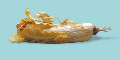 細細端詳,白菜葉莖上,還飾有兩朵小花,一朵含苞,一朵盛放;菜葉與主體的結(jié)合部位,趴伏著一只翠色蟈蟈,蟈蟈雙腿一屈一蹬,正盡情吮吸白菜鮮美的汁水;一只瓢蟲一旁靜臥,須角隱現(xiàn),似乎也在埋頭享用大餐。小花和小蟲的點綴,使得整個作品兼顧野趣和雅致,充滿生命的律動與自然的和諧。