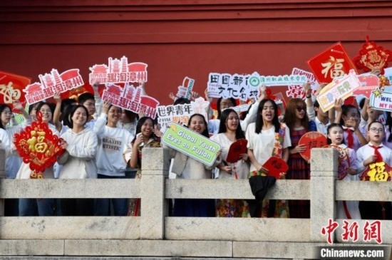 圖為中外青年揮舞手中的中國(guó)結(jié)、“福”字、手牌等,表達(dá)此行的歡樂(lè)和美好。中新社記者 王東明 攝