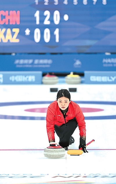 中國隊(duì)選手韓雨在亞冬會(huì)冰壺混雙比賽中擲壺。