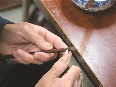 把毛料放在水中仔細(xì)清洗,就著燈光剔除一根根細(xì)微雜毛,將清理后的毛料聚合成圓直光滑、攏抱不散的錐形……走進(jìn)涇縣涇川鎮(zhèn)宣筆制作技藝代表性傳承人佘征軍的工作室,他正在為一支紫毫筆制作筆頭。“白居易有詩(shī)云,‘宣城之人采為筆,千萬(wàn)毛中揀一毫’。此句講的是宣筆制作工藝的復(fù)雜精細(xì)?!辟苷鬈娬f(shuō)。
