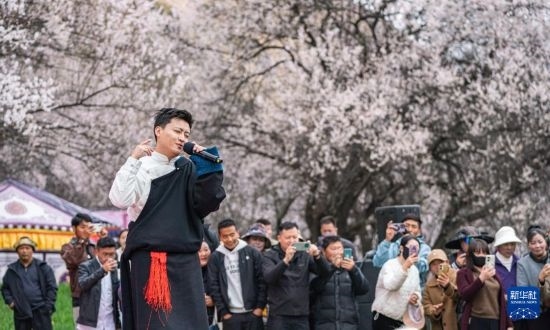 4月3日,歌手在林芝第二十二屆桃花旅游文化節(jié)巴宜區(qū)分會場現(xiàn)場演唱。
