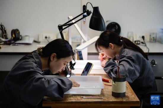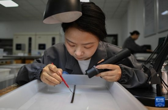 4月24日,荊州文物保護中心簡牘工作室工作人員在清理竹簡。新華社記者 程敏 攝