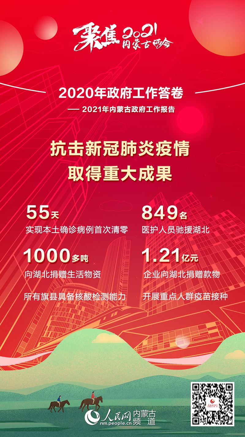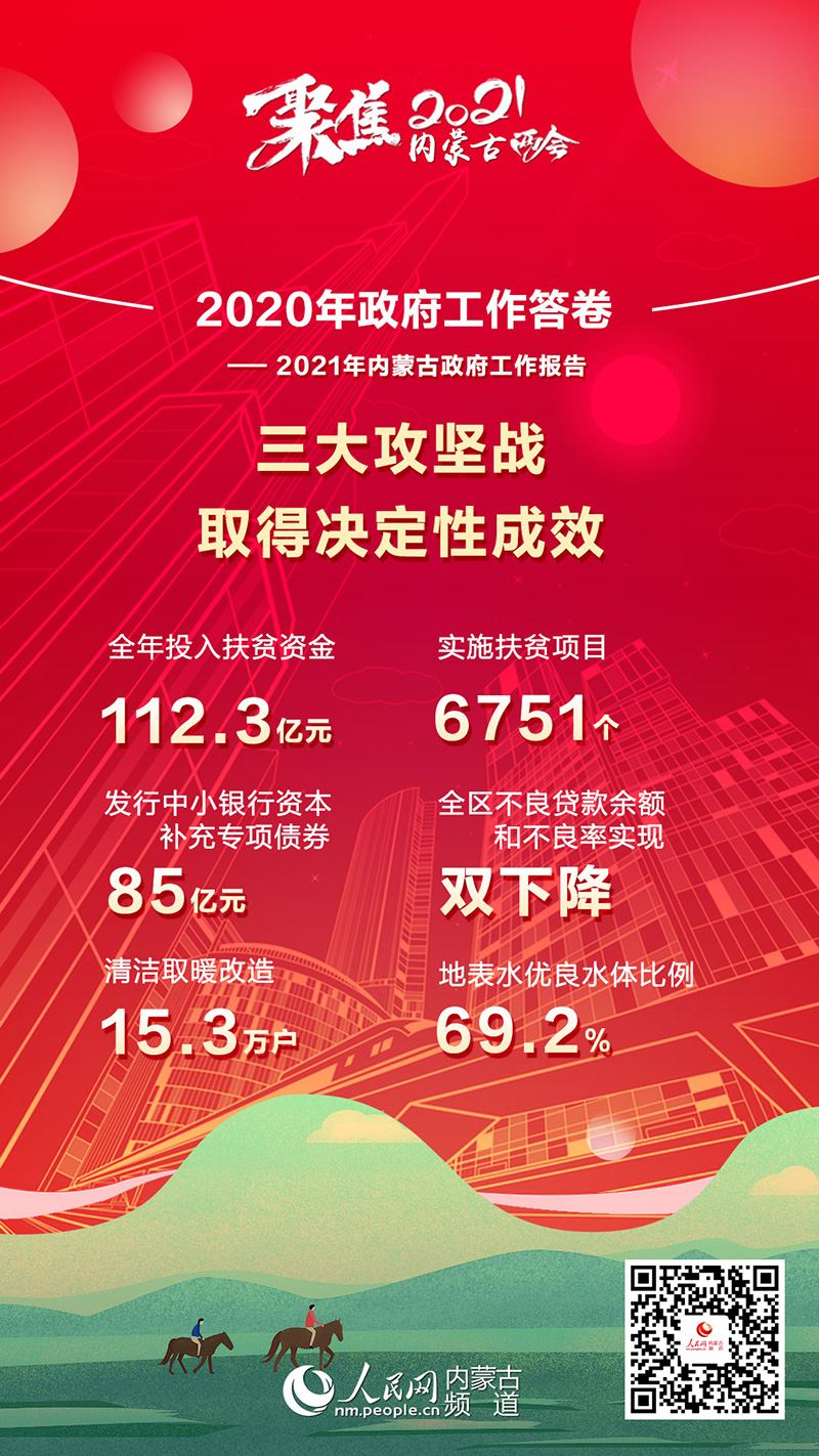 1月26日上午,內(nèi)蒙古自治區(qū)十三屆人大四次會議在內(nèi)蒙古人民會堂開幕。自治區(qū)主席布小林作政府工作報告。2020年是極不平凡的一年,內(nèi)蒙古緊扣全面建成小康社會目標(biāo)任務(wù),堅持穩(wěn)中求進(jìn)工作總基調(diào),堅持以人民為中心,科學(xué)統(tǒng)籌疫情防控和經(jīng)濟(jì)社會發(fā)展,扎實做好“六穩(wěn)”工作,全面落實“六保”任務(wù),全區(qū)經(jīng)濟(jì)持續(xù)回穩(wěn),社會大局和諧穩(wěn)定,“十三五”規(guī)劃順利收官。2020年政府工作有哪些亮點?看內(nèi)蒙古書寫這份精彩答卷!