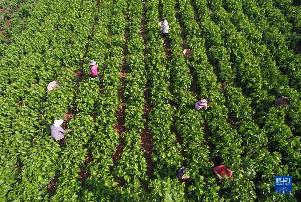 云南尋甸縣金所街道草海子村的農(nóng)婦在采摘蠶桑葉(2020年5月16日攝,無人機照片)。當(dāng)?shù)卮罅Πl(fā)展蠶桑等特色種養(yǎng)殖和加工產(chǎn)業(yè),帶動農(nóng)民脫貧增收致富。新華社記者 楊宗友 攝