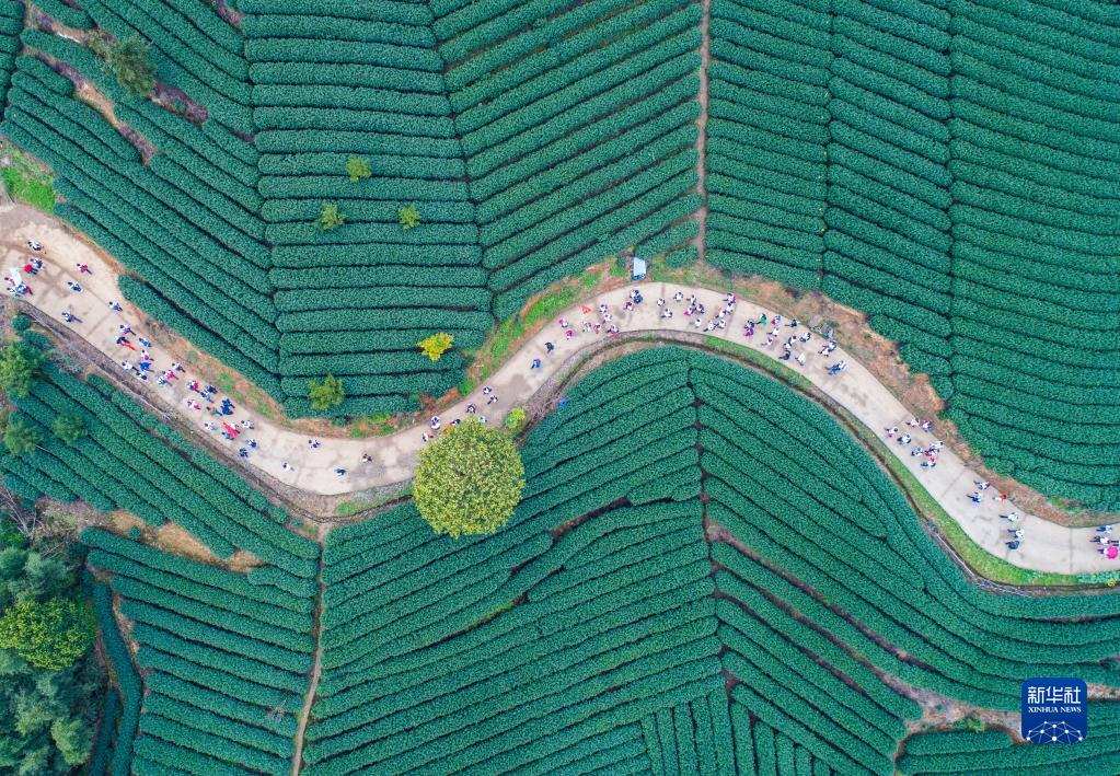 團(tuán)隊游客在杭州市富陽區(qū)拔山村萬畝茶山游覽(2018年3月26日攝,無人機照片)。浙江省“千村示范、萬村整治”工程撬動了鄉(xiāng)村從美麗生態(tài)到美麗經(jīng)濟,再到美好生活的良性循環(huán)。2018年,浙江“千萬工程”獲得聯(lián)合國“地球衛(wèi)士獎”中的“激勵與行動獎”。新華社記者 徐昱 攝