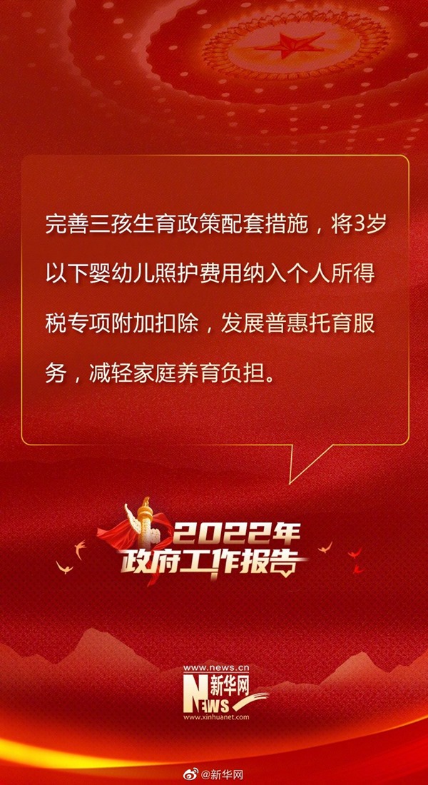 加強(qiáng)社會保障和服務(wù)。穩(wěn)步實(shí)施企業(yè)職工基本養(yǎng)老保險全國統(tǒng)籌,適當(dāng)提高退休人員基本養(yǎng)老金和城鄉(xiāng)居民基礎(chǔ)養(yǎng)老金標(biāo)準(zhǔn),確保按時足額發(fā)放。繼續(xù)規(guī)范發(fā)展第三支柱養(yǎng)老保險。加快推進(jìn)工傷和失業(yè)保險省級統(tǒng)籌。做好軍人軍屬、退役軍人和其他優(yōu)撫對象優(yōu)待撫恤工作。積極應(yīng)對人口老齡化,優(yōu)化城鄉(xiāng)養(yǎng)老服務(wù)供給,支持社會力量提供日間照料、助餐助潔、康復(fù)護(hù)理等服務(wù),鼓勵發(fā)展農(nóng)村互助式養(yǎng)老服務(wù),推動老齡事業(yè)和產(chǎn)業(yè)高質(zhì)量發(fā)展。完善三孩生育政策配套措施,將3歲以下嬰幼兒照護(hù)費(fèi)用納入個人所得稅專項(xiàng)附加扣除,發(fā)展普惠托育服務(wù),減輕家庭養(yǎng)育負(fù)擔(dān)。強(qiáng)化未成年人保護(hù)。提升殘疾預(yù)防和康復(fù)服務(wù)水平。加強(qiáng)民生兜底保障和遇困群眾救助,努力做到應(yīng)保盡保、應(yīng)助盡助。