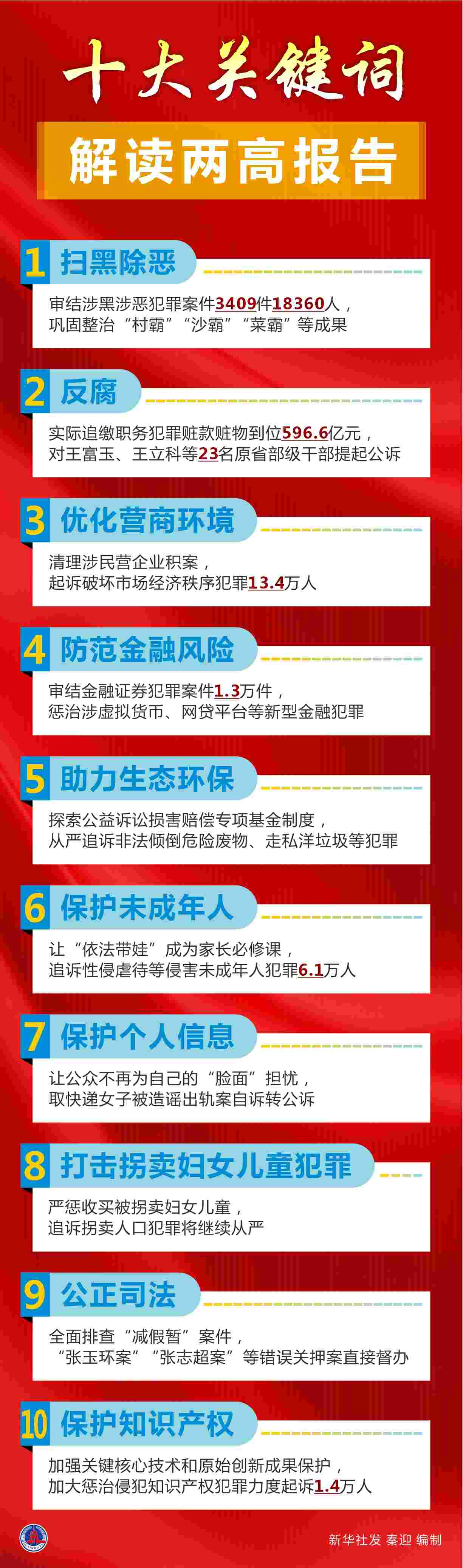 兩高報(bào)告凸顯依法治國(guó)的決心與力度。點(diǎn)名秦光榮、王富玉、王立科等落馬腐敗分子,提及陶革涉黑案、張玉環(huán)案、取快遞女子被造謠出軌案等引發(fā)社會(huì)關(guān)注的案件。常態(tài)化掃黑除惡、高壓反腐、打擊拐賣(mài)婦女兒童犯罪、保護(hù)公民個(gè)人信息等法治重點(diǎn),與群眾關(guān)切高度契合。