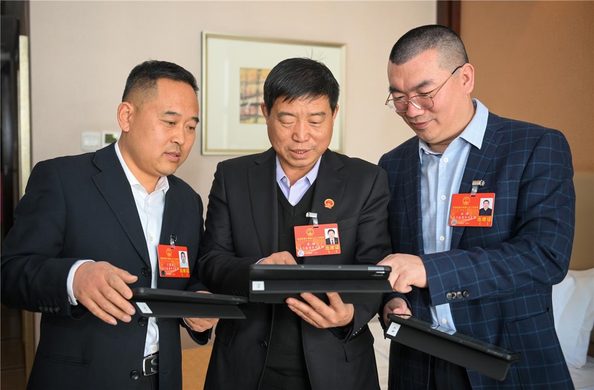 出席自治區(qū)十四屆人大二次會議的人大代表丁慧杰(左)、李俊(中)、石海認(rèn)真研讀會議材料。