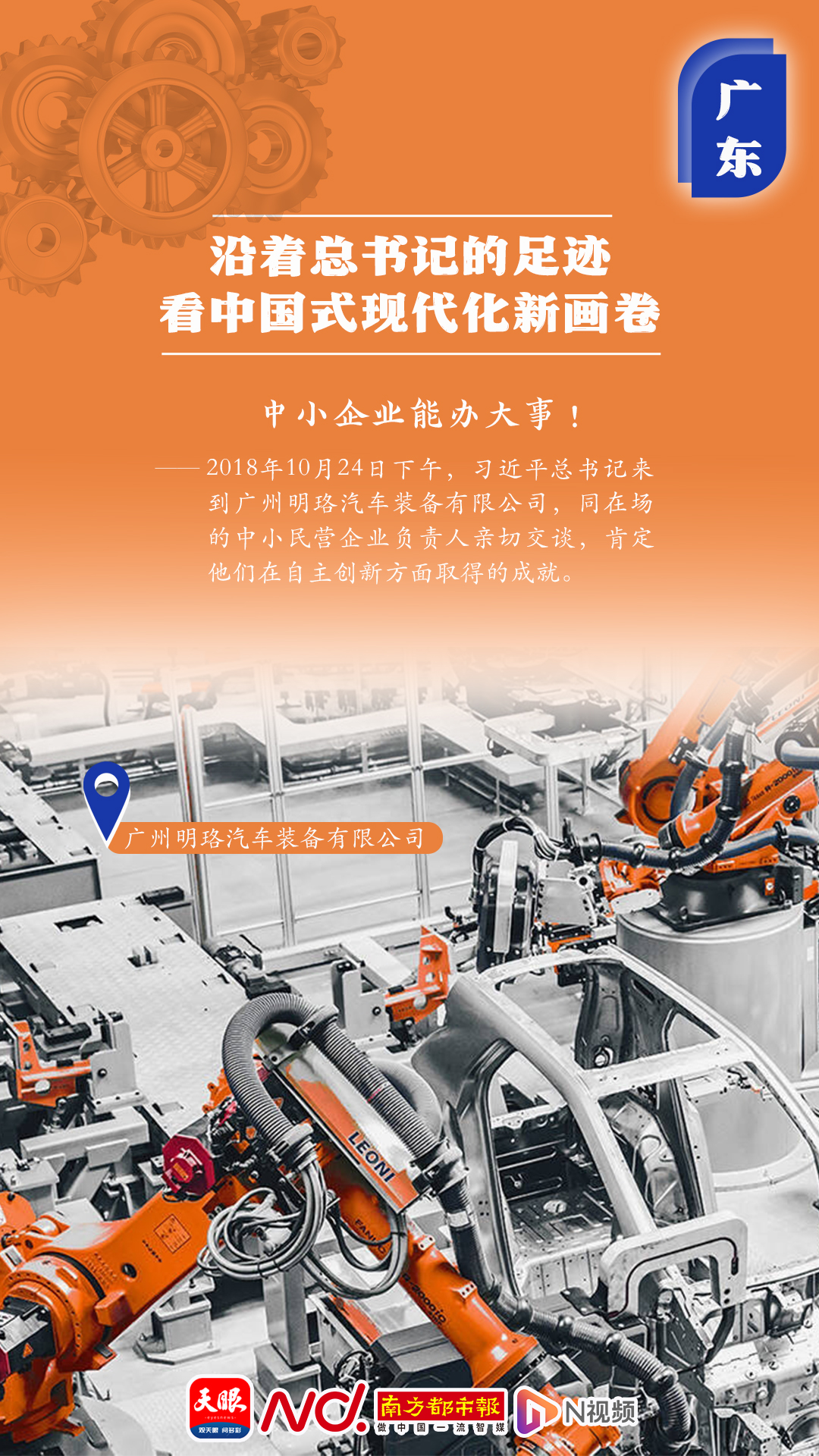 “中小企業(yè)能辦大事!”2018年10月24日下午,習近平總書記來到廣州明珞汽車裝備有限公司,同在場的中小民營企業(yè)負責人親切交談,肯定他們在自主創(chuàng)新方面取得的成就。