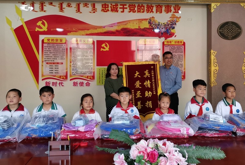 活動當(dāng)天,人們來到阿拉善左旗蒙古族實驗小學(xué),為烏日力格等10位貧困蒙古族學(xué)生送去學(xué)生用品及衣物,雙方支部還為學(xué)校捐贈無限極植雅洗手液兩箱。