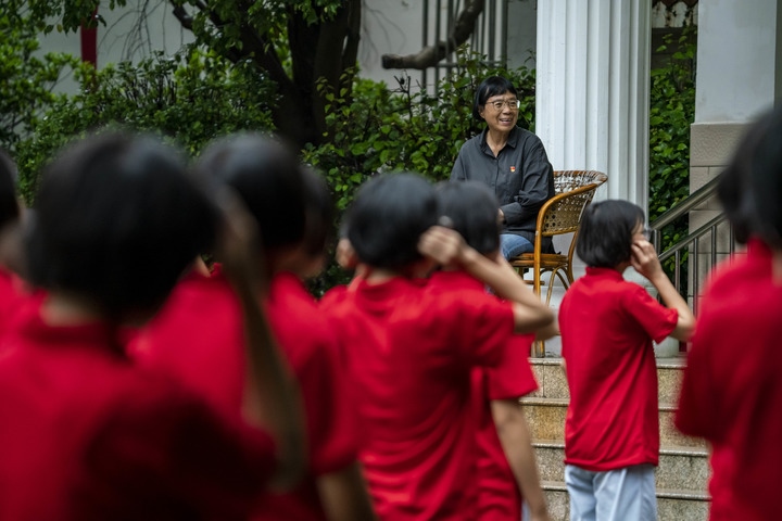 張桂梅觀看新生學習課間操(2021年8月24日攝)。新華社記者江文耀攝