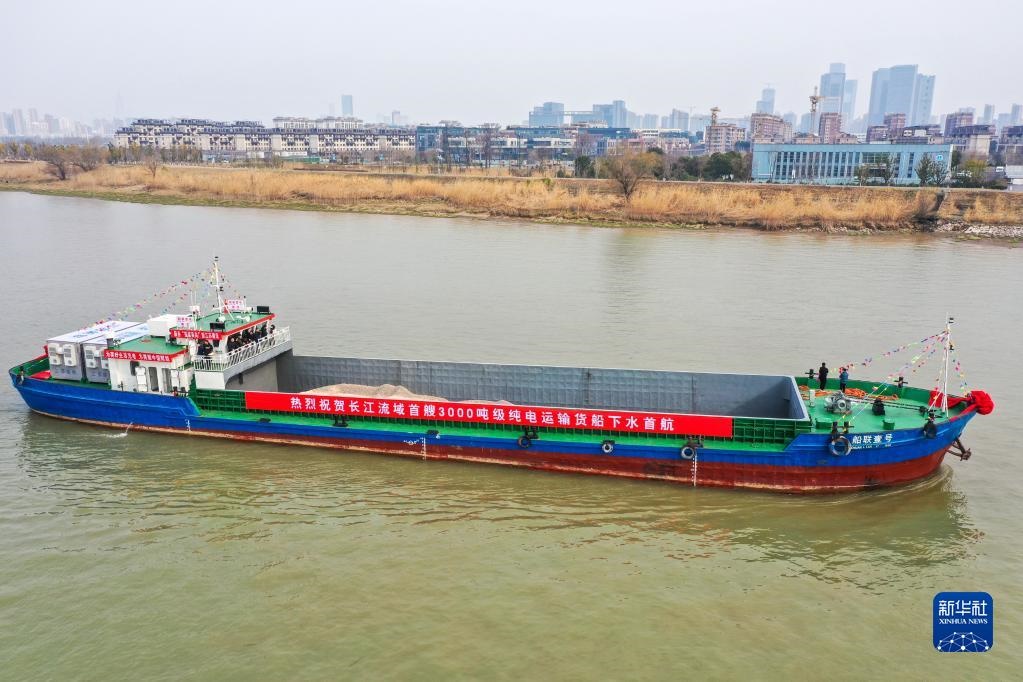 “船聯(lián)1號”電動貨船在長江南京段航行(2月22日攝,無人機(jī)照片)。