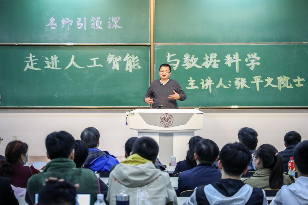 中國科學(xué)院院士張平文為南開學(xué)子講授“名師引領(lǐng)”通識課之“走進(jìn)人工智能與數(shù)據(jù)科學(xué)”。(南開大學(xué)供圖)