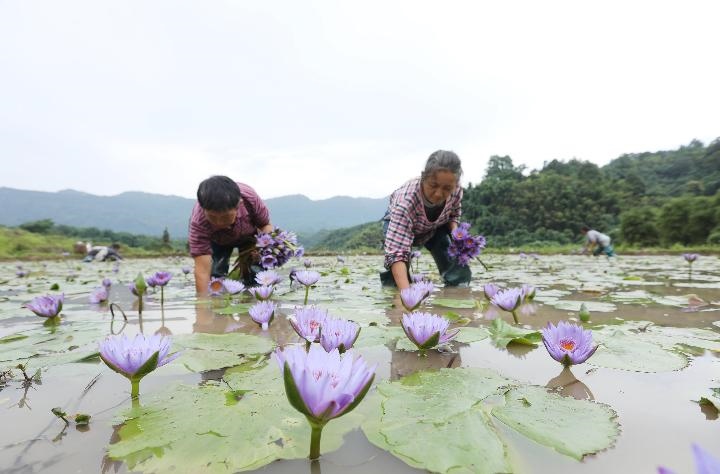 2022年6月28日,在貴州省赤水市寶源鄉(xiāng)玉豐村,村民在采摘香水蓮花。近年來,貴州省赤水市寶源鄉(xiāng)采取“黨支部+合作社+農(nóng)戶”模式,引導(dǎo)農(nóng)民種植集觀賞、藥用、食用為一體的香水蓮花,帶動(dòng)農(nóng)民增收,助力鄉(xiāng)村振興。新華社發(fā)(王長育 攝)